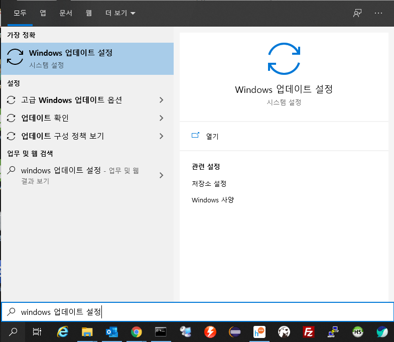 시작메뉴 검색창(Win키+s)에서 "windows 업데이트 설정" 검색
