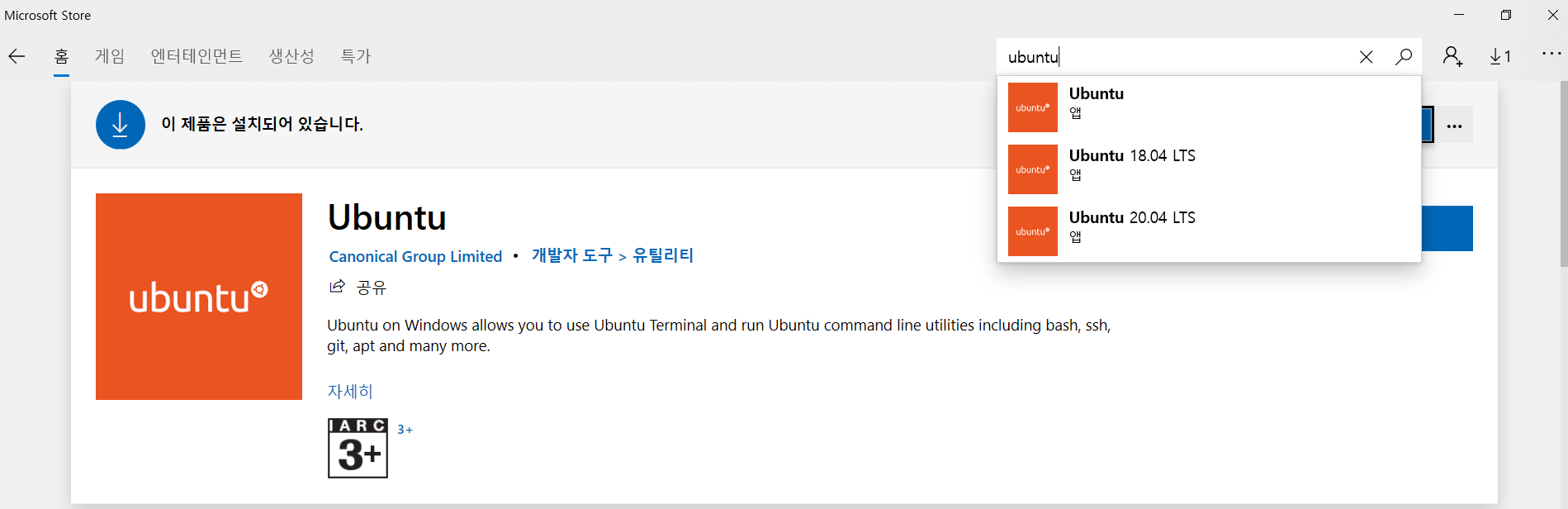 검색창에 "Microsoft Store"를 검색하여 실행 후 "ubuntu"검색하여 설치 및 실행