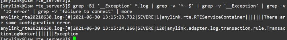 - vi에서는 검색(/)에서 다음과 같은 정규표현식(/[^IO error]\_.<<__Exception) 을 통해서 아주 간단하게 위와 비슷한 결과를 도출할 수 있었습니다. 하지만 용량이 큰 .log파일을 vi로 열 경우 서버에 부하가 발생하므로, 주로 more나 less를 사용하는데 more나 less에서는 위 정규표현식이 통하질 않아서 여러가지 간단한 방법을 찾다가 실패하고 결국 조금 복잡한 grep을 다중으로 사용하는 방법을 찾게 되었습니다.