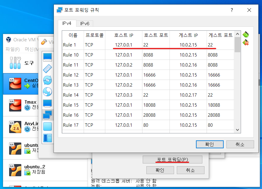 - ex. 가상시스템의 10.0.2.15:22 주소로 PC에서 ssh접속이 필요한 경우