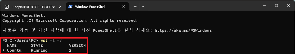 b. wsl -l -v 명령어를 입력해서 Ubuntu 상태가 Running 이고 버전이 2 인 것을 확인