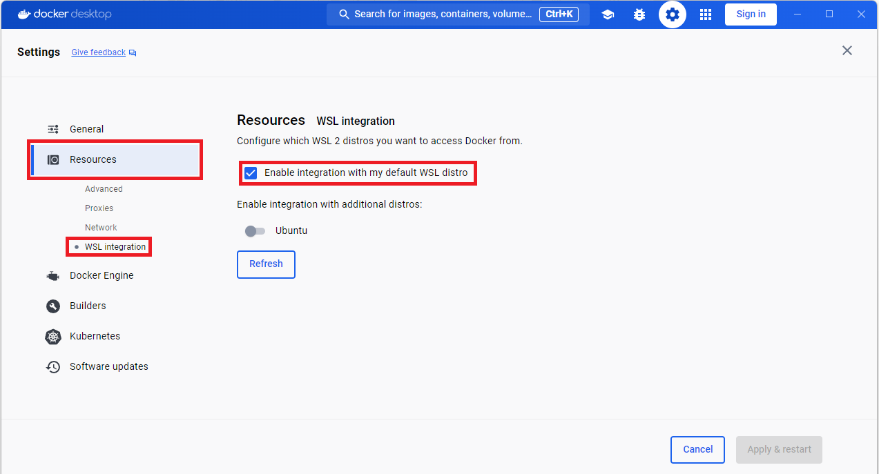 c. Settings > Resource > WSL integration > Enable integration with my default WSL distro 체크 확인
