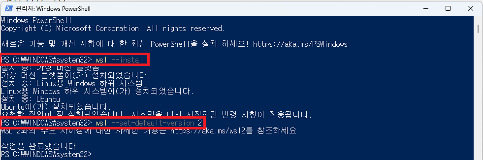 b. wsl --set-default-version 2 명령어를 입력해서 WSL2를 기본 버전으로 설정