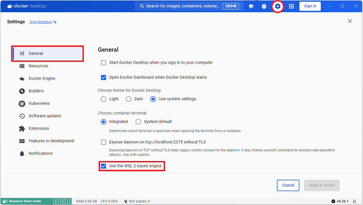b. Settings > General > Use the WSL 2 based engine 체크 확인