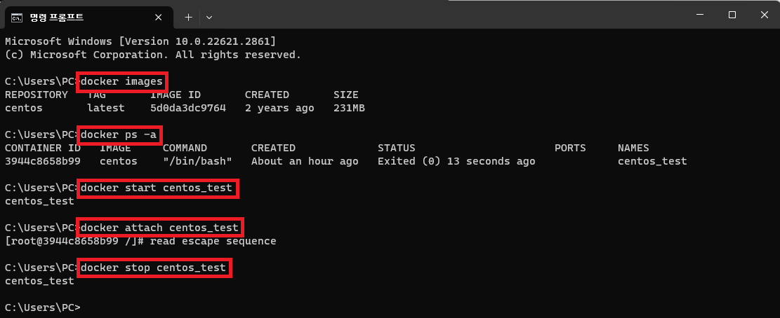 2. cmd창에서 docker 명령어를 통해서 centos 컨테이너 생성