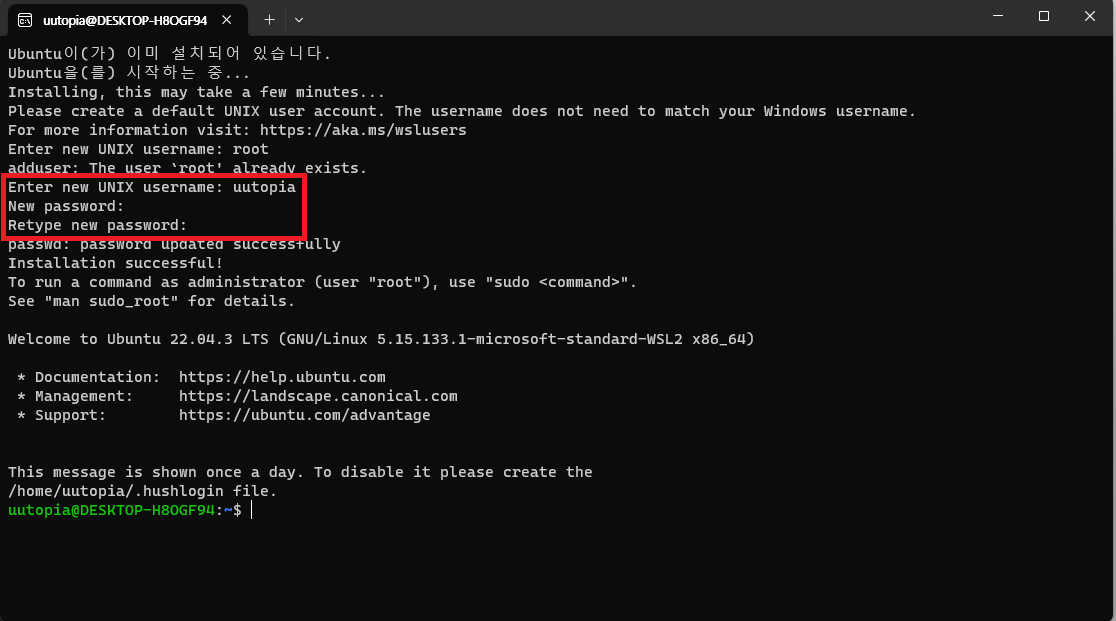 3. WSL2 Ubuntu 설치 완료 후 계정 추가