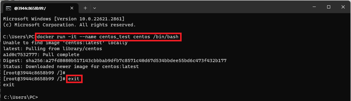 a. docker run -it --name centos_test centos /bin/bash 명령어 실행 시
