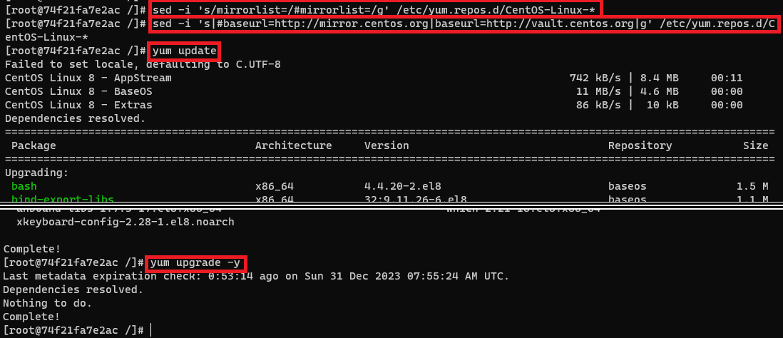 b. sed -i 's|#baseurl=http://mirror.centos.org|baseurl=http://vault.centos.org|g' /etc/yum.repos.d/CentOS-Linux-* 명령어로 yum 기본저장소 주소 변경