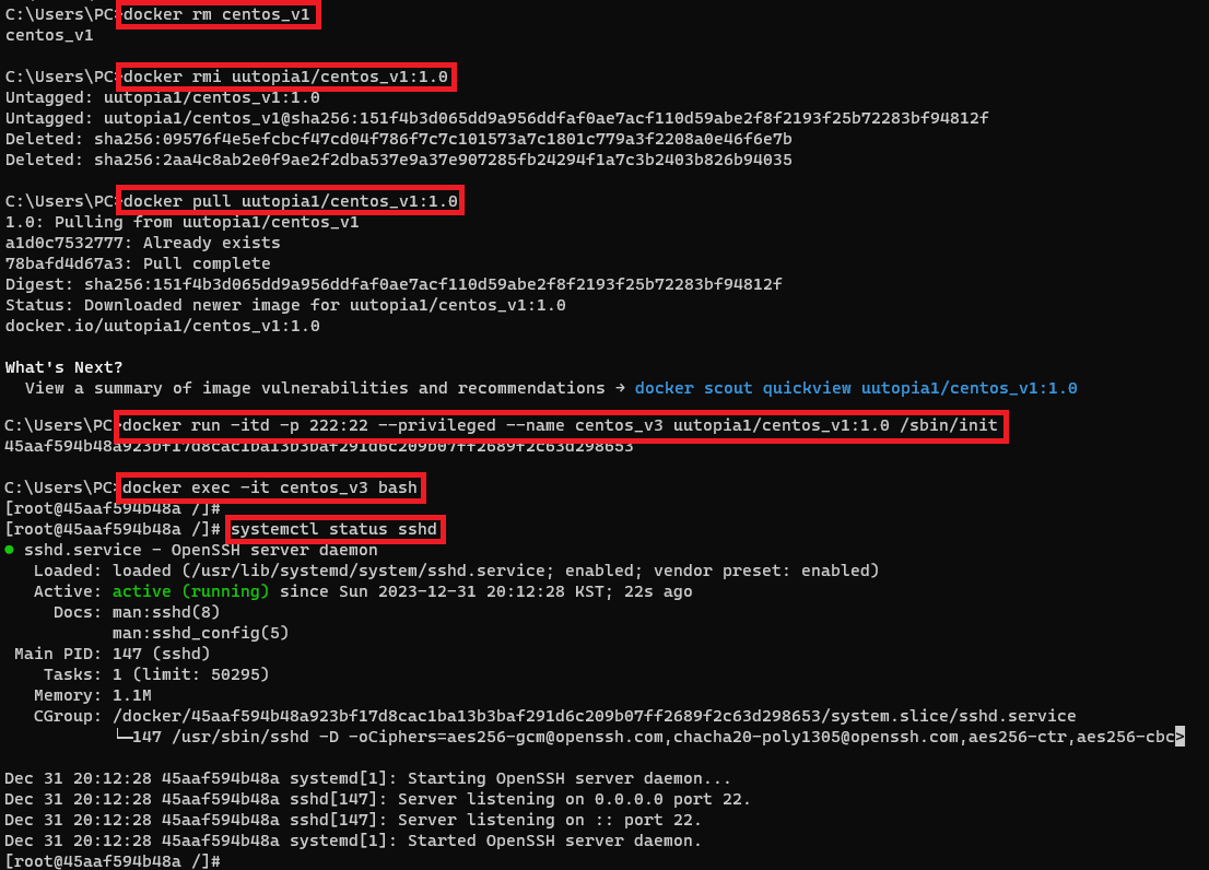 d. docker run -it -p 222:22 --privileged --name centos_v2 uutopi1/centos_v1:1.0 /sbin/init 명령어 실행 시