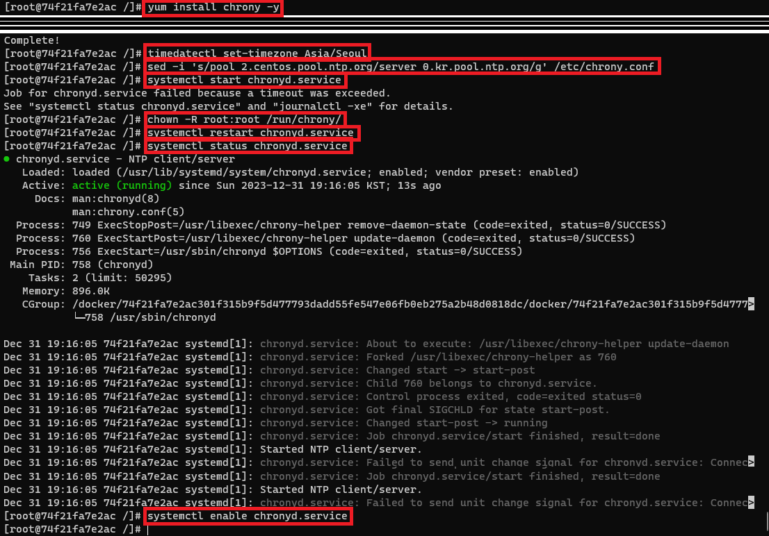 e. chown -R root:root /run/chrony/ 명령어로 /run/chrony/ 디렉터리 소유자를 root로 변경 (d. 실패 원인 해결)