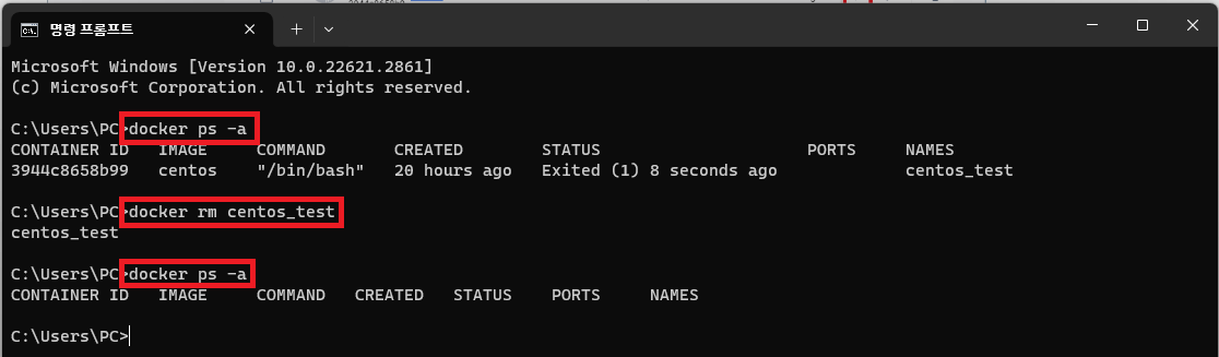 c. docker rm centos_test 명령어로 기존 컨테이너를 삭제