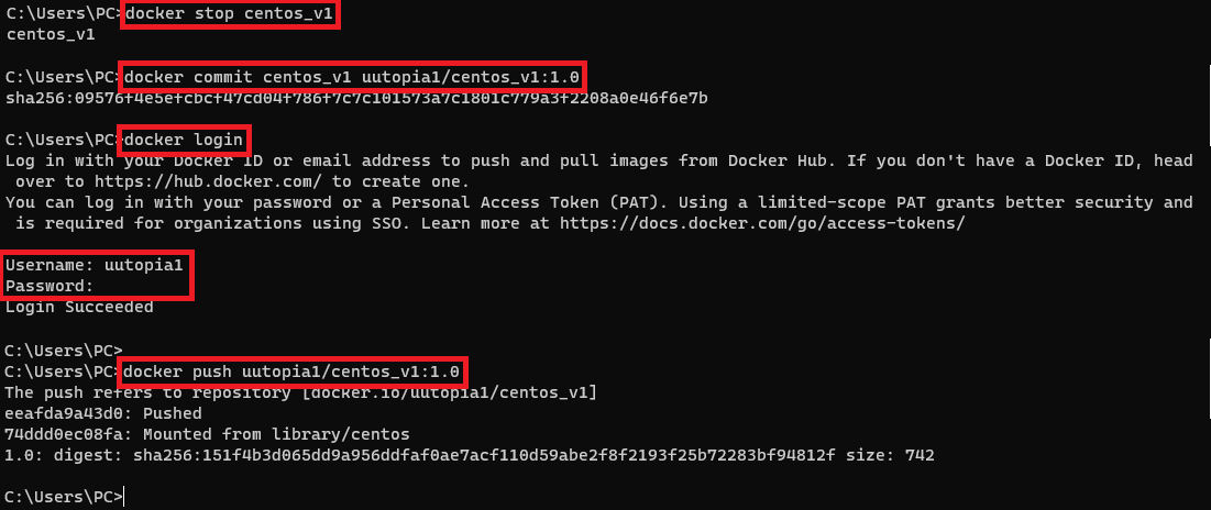 b. docker commit centos_v1 uutopia1/centos_v1 명령어로 centos_v1 컨테이너를 uutopia1/centos_v1 이미지로 만들기