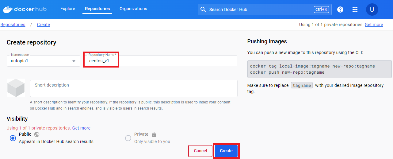 e. docker push uutopia1/centos_v1:1.0 명령어로 uutopia1/centos_v1 이미지를 허브의 uutopia1/centos_v1 저장소에 1.0버전으로 업로드