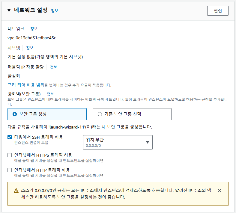 네트워크는 기본 세팅으로 진행한다. (원격 접속을 위한 SSH 접속 허용)