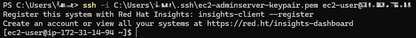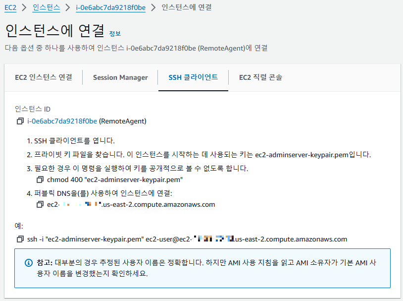 ssh -i C:\Users\[계정명]\.ssh\ec2-adminserver-keypair.pem ec2-user@[IP]