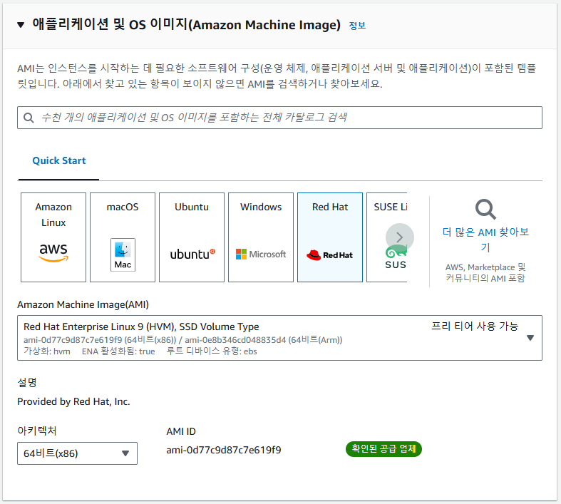 프리티어로 사용가능한 이미지를 선택한다. (Red Hat이나 Ubuntu 추천)