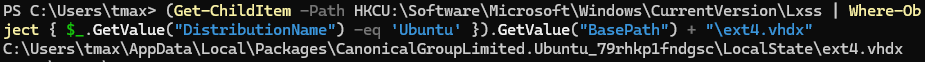 (Get-ChildItem -Path HKCU:\Software\Microsoft\Windows\CurrentVersion\Lxss | Where-Object { $_.GetValue("DistributionName") -eq '<distribution-name>' }).GetValue("BasePath") + "\ext4.vhdx"