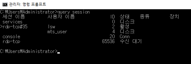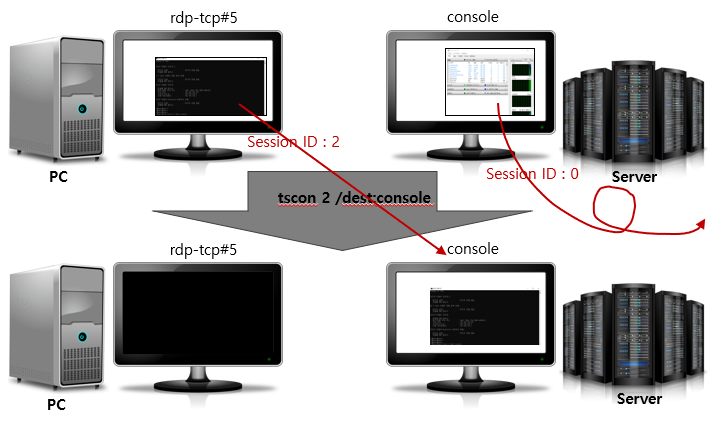 -즉, 내가 PC에서 2번 세션ID로 서버에 원격을 붙어서 프로그램을 구동하다가 tscon 2 /dest:console 명령어를 실행하면 내 PC의 원격연결은 끊기고 console화면(서버화면)에 내 작업환경을 띄우게 된다. 그리고 console화면에서 작업중이던 환경은 연결을 잃게 된다.