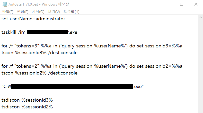 일단 연결이 끊어진 상태에서 bat파일로 tscon console을 실행하면 오류가 발생한다. 아마도 현재 세션의 연결을 찾지 못해서 발생하는 현상으로 보인다. 이 경우 tscon 2 /dest:console와 같이 현재 세션ID(ex. 2)를 직접 입력하는 방식을 사용하면 대부분 해결 되지만 아직 문제가 남아있다.