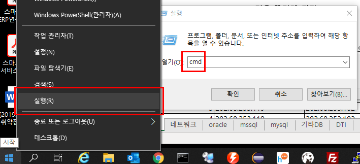 윈도우 > 시작 > 실행에 cmd를 입력하면 실행되며 다양한 기능을 사용하기 위해서는 관리자권한으로 실행한다.