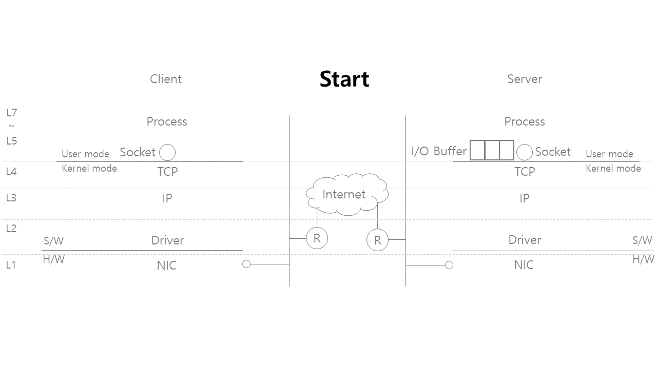 TCP 통신 과정을 쉽게 이해하기 위한 수단 중 하나는 그림이나 영상을 통해서 실제 동작 과정을 머리속으로 이미지화 해보는 것이라고 생각한다. 반대로 TCP통신 과정을 그려내지 못한다면 제대로 이해하지 못하고 있는 것이다. 그림은 두 서버간 데이터를 송수신할 때 각 Layer에서의 처리과정과 데이터 표현방식을 한눈에 볼 수 있도록 정리한 내용이다. Layer1~7은 OSI 7계층을 의미하며, 편의상 L5~L7은 묶어서 표현했다. 네크워크 상에서 데이터는 Packet단위로 쪼개져서 송수신 되기때문에 Client와 Server는 I/O Buffer를 사용해서 송수신 되는 Packet들을 Buffer에 임시로 저장하고 읽으면서 순서에 맞게 분해하고 조립하는 과정이 필요하다. 또한 Packet이 각 Layer를..