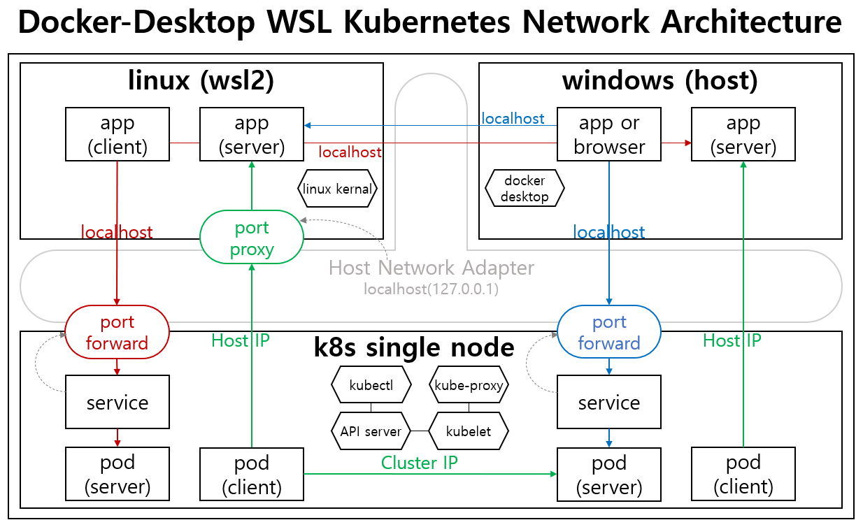 도커 데스크탑 쿠버네티스 환경 wsl-host-k8s 저장소 구성도 wsl2 docker desktop kubernetes 환경 구축 시 다루게 되는 3개의 시스템(윈도우, 리눅스, 쿠버네티스)간에 파일을 접근하기 위해서는 위 그림과 같은 경로로 접근할 수 있다. 예를 들어서 쿠버네티스 환경의 persistent volume의 hostPath를 지정하는 경우 "/run/desktop/mnt/host/c" 경로를 통해서 k8s single node의 호스트인 윈도우의 c:\ 경로에 접근할 수 있다.